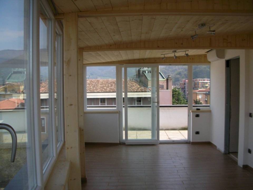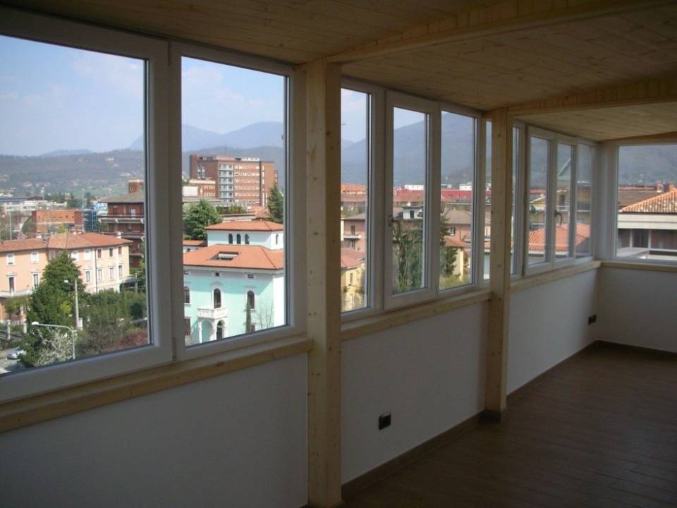 Ristrutturazione veranda abitazione privata - Brescia. Chiusura terrazza con serramenti in PVC. Finestre e parti fisse, con scorrevole rientrante che affaccia sull'esterno.