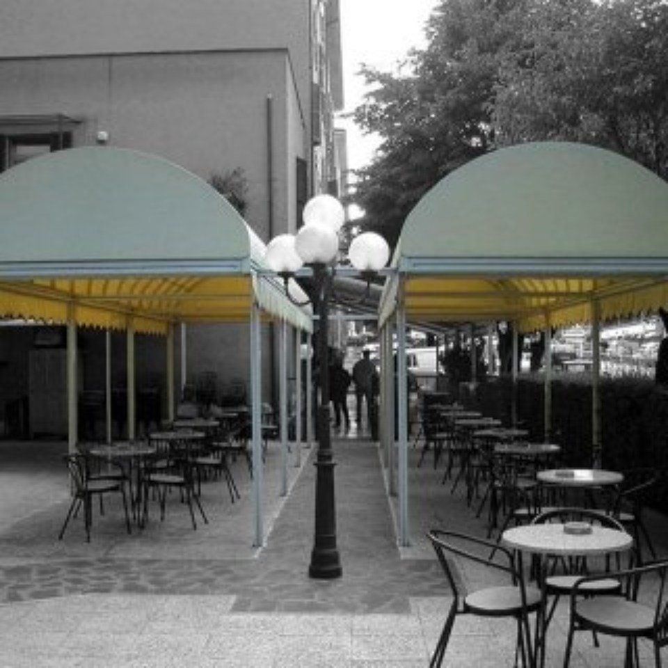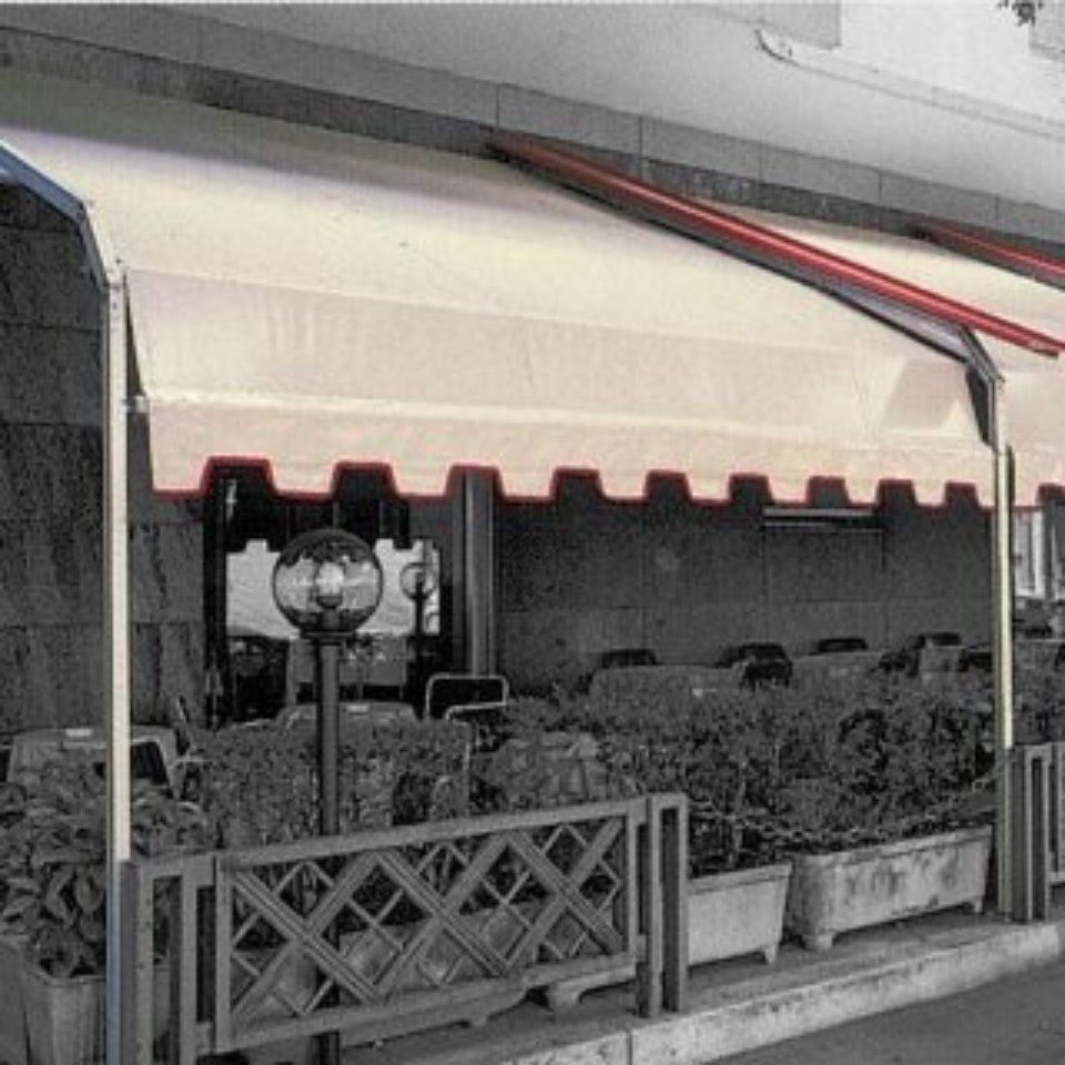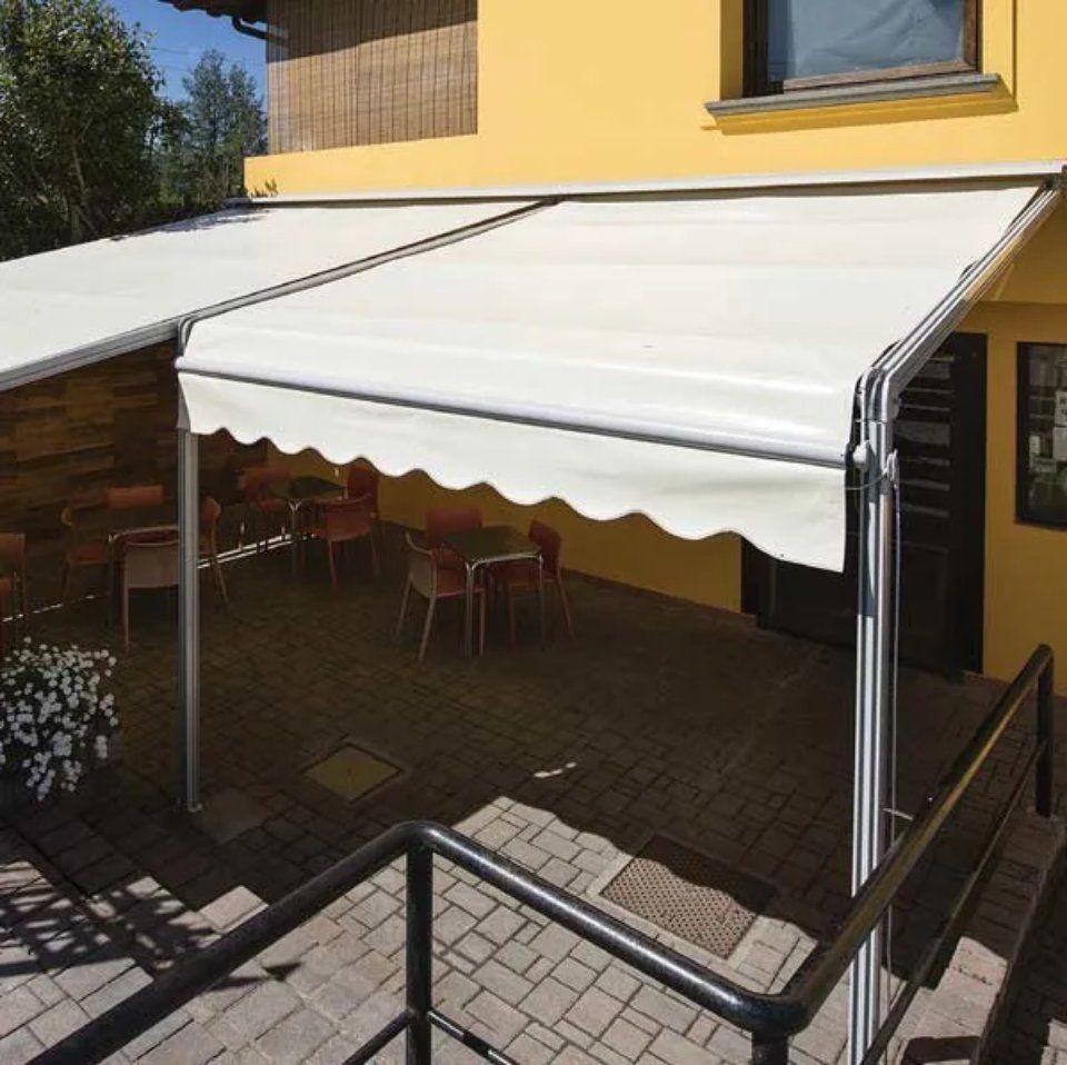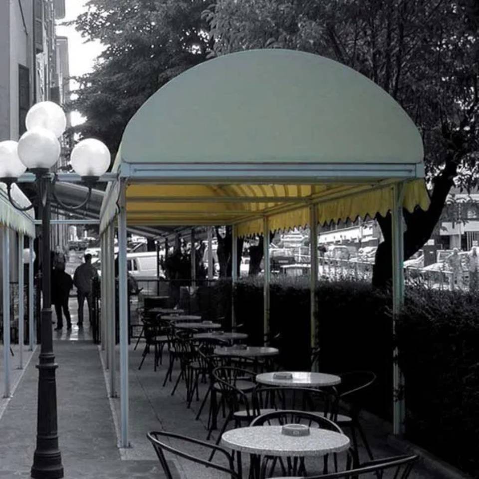 Strutture autoportanti in alluminio laccato e particolari in alluminio pressofuso. Tessuti con colori esclusivi in dralon acrilico idrorepellente o poliestere impermeabile. Rifiniture e volants in vari colori, disegni garantiti, personalizzazioni a richiesta.